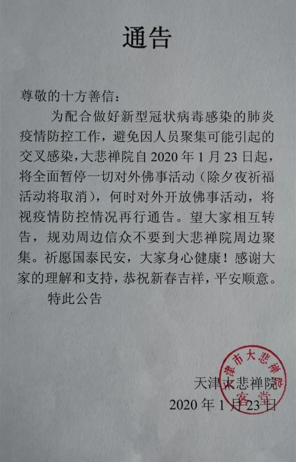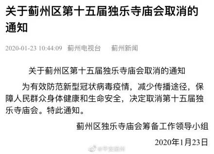 蓟州区独乐寺庙会筹备工作组发布通知,为有效防范新型冠状病毒疫情,减少传播途径,保障人民群众身体健康和生命安全,决定取消第十五届独乐寺庙会。