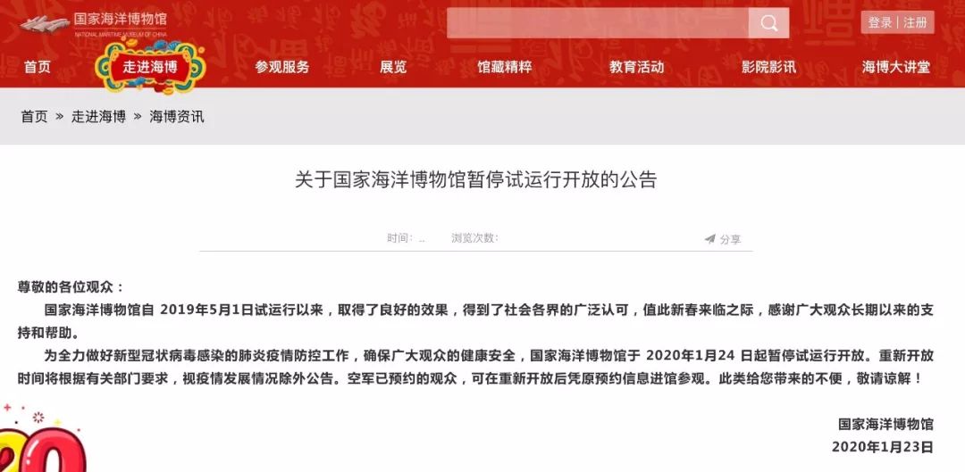 从国家海洋博物馆了解到,为全力做好新型冠状病毒感染的肺炎疫情防控工作,确保广大观众健康安全,国家海洋博物馆于2020年1月24日起暂停试运行开放。重新开放时间将根据有关部门要求,视疫情发展情况另行公告。此前已预约的观众,可在重新开放后凭原预约信息进馆参观。