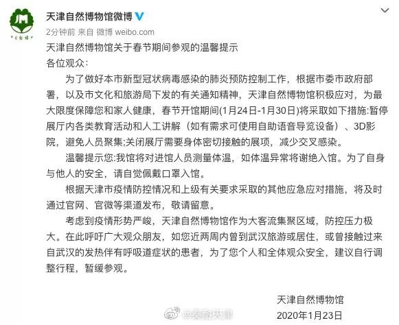 为了做好本市新型冠状病毒感染的肺炎预防控制工作,根据市委市政府部署,以及市文化和旅游局下发的有关通知精神,天津自然博物馆积极应对,为最大限度保障您和家人健康,春节开馆期间(1月24日-1月30日)将采取如下措施:暂停展厅内各类教育活动和人工讲解(如有需求可使用自助语音导览设备)、3D影院,避免人员聚集;关闭展厅需要身体密切接触的展项,减少交叉感染。