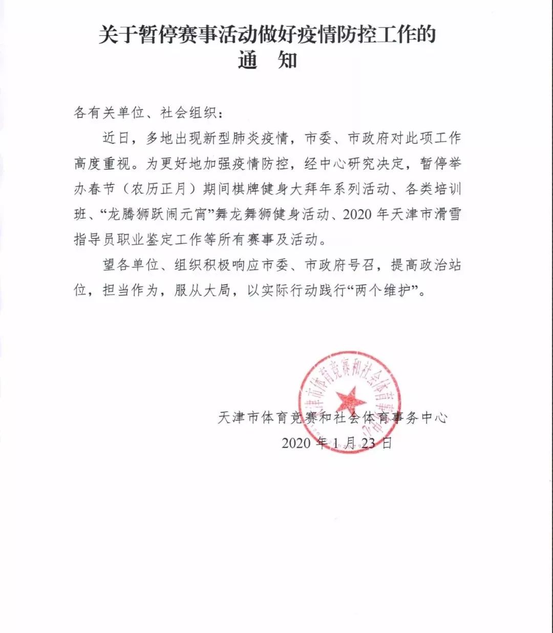 关于取消大年初一公共体育场馆设施免费低收费开放活动的通知
