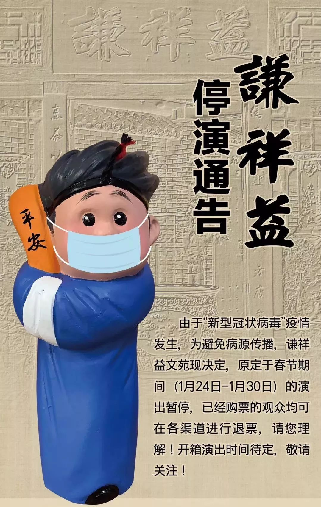 谦祥益文苑发布暂停表演通告,1月24日-30日的演出暂停,退票已经开始办理了。开箱时间待定。
