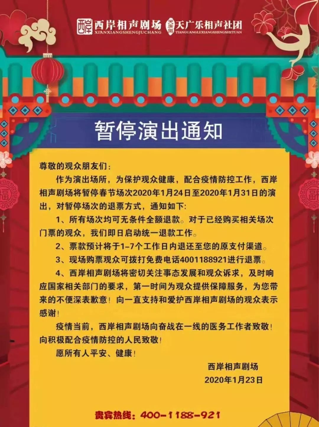 西岸相声剧场发布暂停演出通知,1月24日-31日的演出暂停,所有场次均可无条件全额退款。