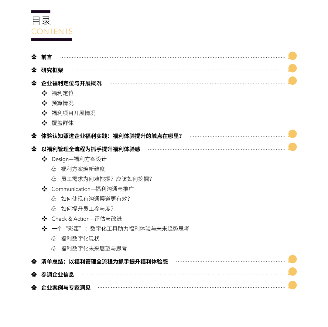 报告的最后,我们也结合企业实践梳理了体系化的福利体验提升建议:清单总结:以福利管理全流程为抓手提升福利体验感,希望可以给到您一些启发与帮助。