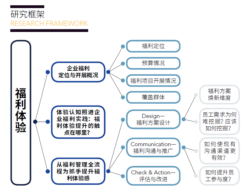 基于以上观察与挑战,智享会联动点滴关怀开展了《福利体验研究报告》。旨在通过市场对标数据了解位于不同福利成熟度的企业现状与基础,并结合企业对于体验的认知,以福利管理全流程为抓手探讨可供参考的福利体验提升维度。