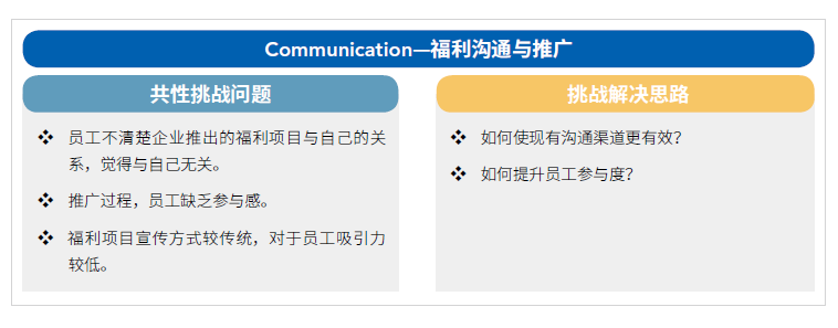 可是在整体福利市场趋于同质化的当下,员工似乎已经越来越感觉不到福利的存在了。企业希望为员工提供多样化,人性化,并可以惠及员工家人的福利保障,而更多的员工却觉得健康风险与自己相去甚远,礼品集采配的发放模式也过于简单粗暴而众口难调。员工就更喜欢将福利转为现金“落袋为安”。企业虽然每年铺设了大量的线上线下福利沟通渠道,但是实际效果却似乎还是不尽如人意。